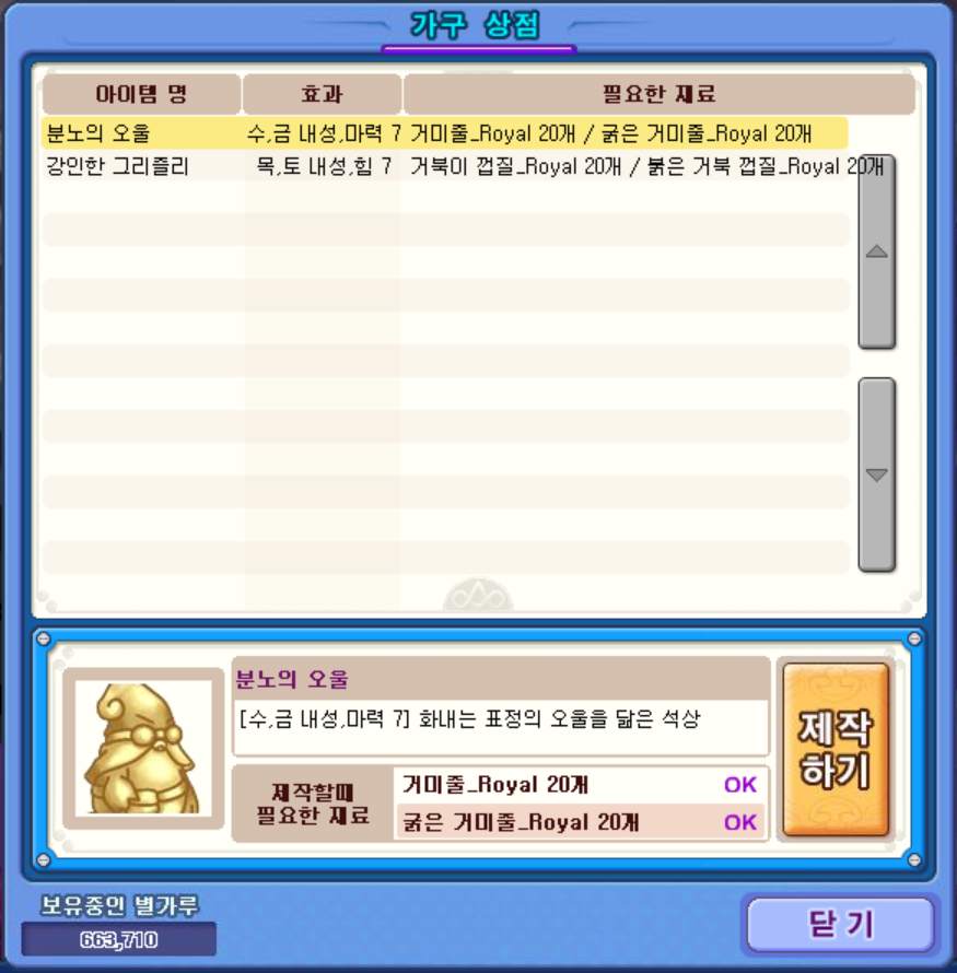 레벨 업을 하면서 재료들을 꽤나 많이 모았던 덕분이지 바로바로 남은 가구들을 제작할 수 있었습니다.