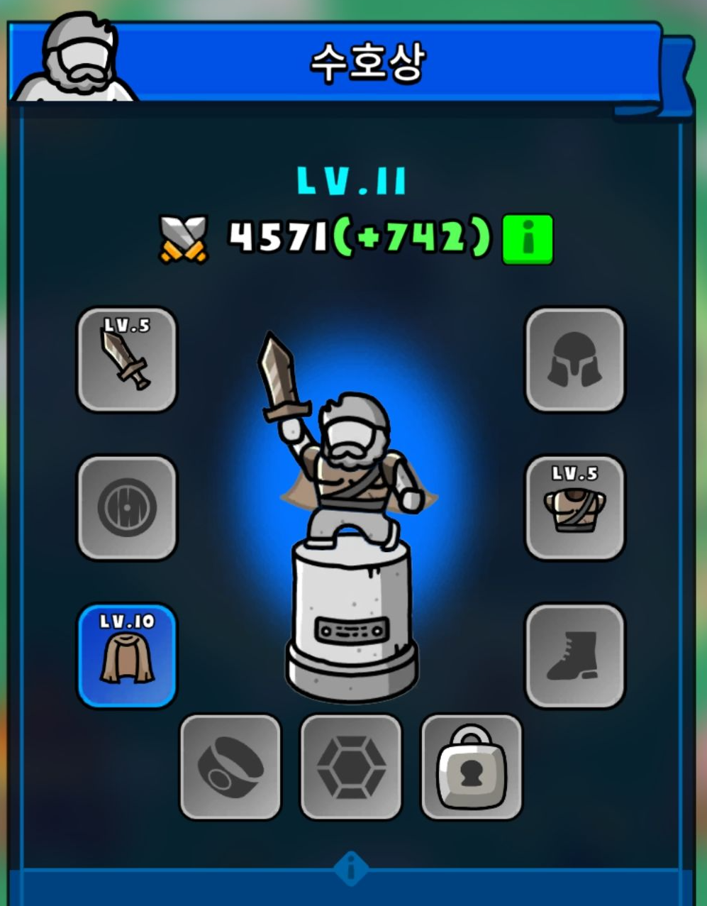 마을 정중장에 수호상이 존재하는데 동상에다가 장비를 입혀줄 수 있습니다. 이러면 전투력에 일괄적으로 적용이 되기 때문에 영웅 마다 장비를 장착하는 그런 방식은 아니여서 그건 좀 편했습니다.