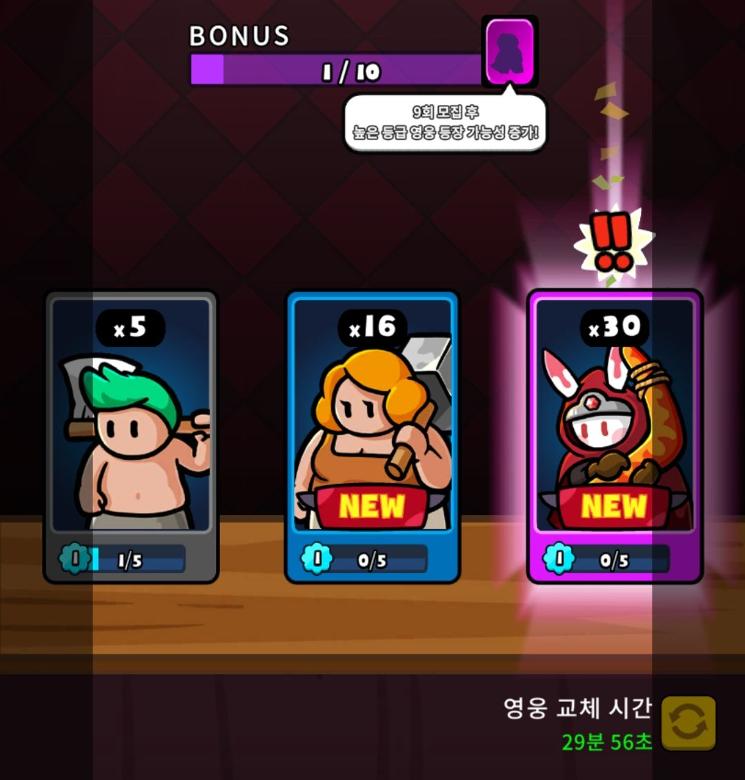 '주점'에서 골드를 사용해 영웅을 모집할 수 있습니다. 그렇게 영웅을 모아서 '고기'를 사용해서 업그레이드를 하는 방식입니다. 전체적으로 재화를 다양하게 많이 쓰이는 구조로 되어있는데요.