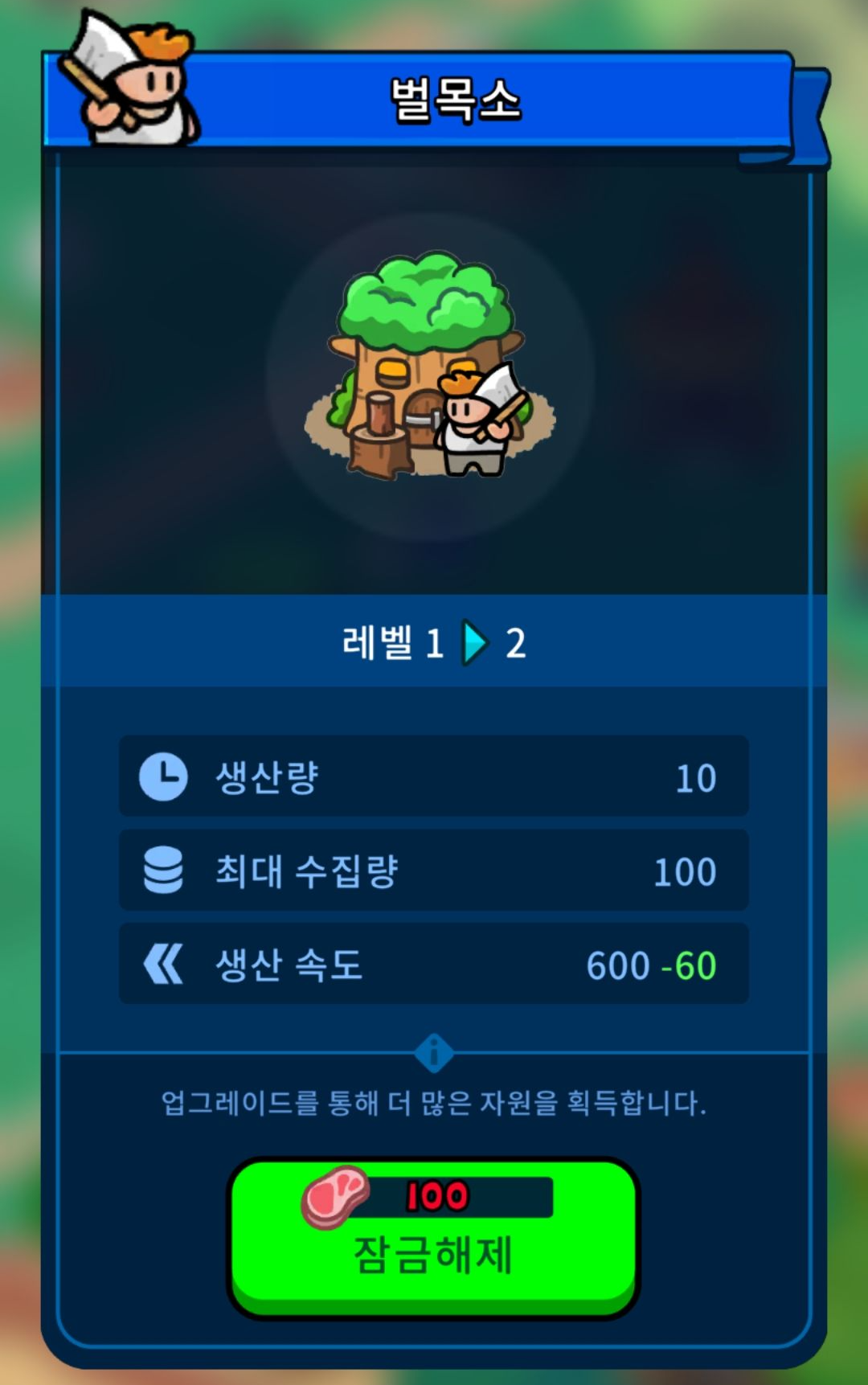그리고 목재, 광석, 골드는 직접 채굴을 하는 방법이 있지만 자동으로 얻는 방법도 있습니다. 재화가 남으면 이쪽을 업그레이드를 투자를 해주었습니다.