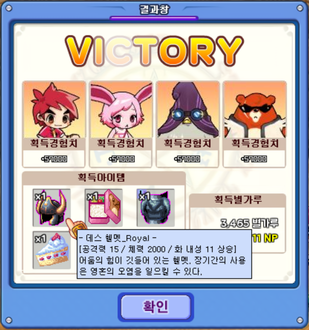 다행히 그리즐리의 '발차기'로 발동 확률을 낮춰놓으니 더 이상 사용하지는 않았고, 빠르게 잡을 수 있었습니다. 보스 아이템으로 '데스 헬멧_Royal'을 얻었습니다.