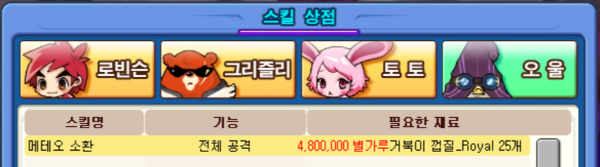 그렇게 별가루 480만개를 모아서 스킬을 배웠습니다. 무엇을 먼저 배워야 하나 고민을 했는데, 결국 모두 다 광역기 스킬이기 때문에 강력하고 속성이 달린 오울의 '메테오 소환'을 배우기로 했습니다.