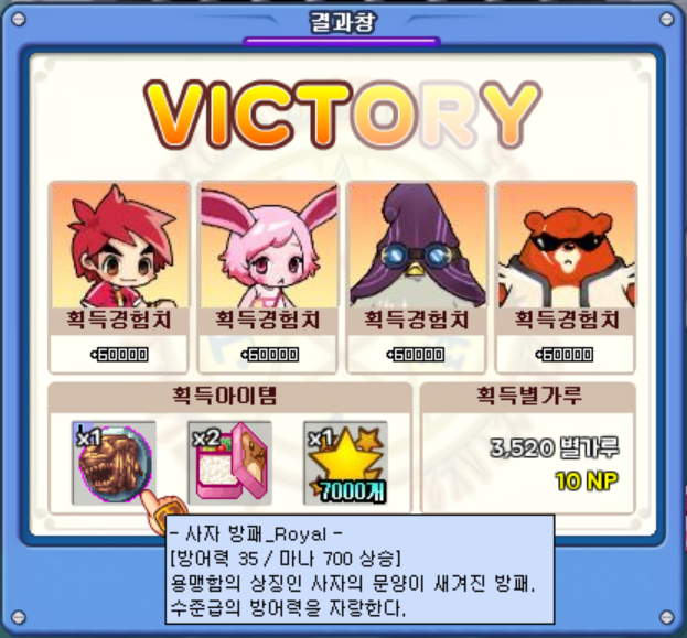 아무튼 꽤나 힘들었지만 만티코어는 체력 회복을 하지 않기 때문에 비슷비슷한 시간대에 잡을 수 있었습니다. 보스 아이템으로 '사자 방패_Royal'을 얻었는데, 기존에 착용하고 있던 방패가 능력치가 비슷비슷해서 적당히 맞춰서 사용하기로 했습니다.