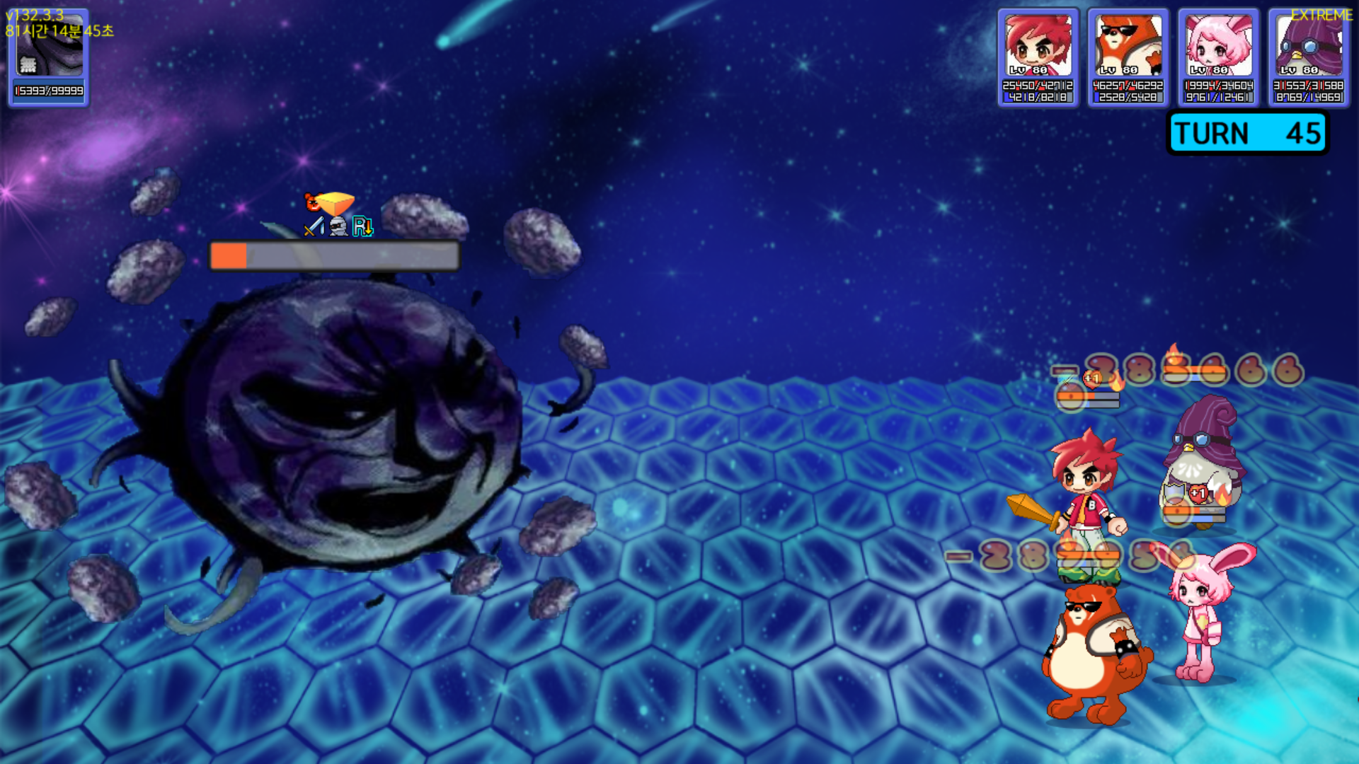 이제 45턴까지 버티면서 즉사 공격도 무사히 넘겼는데요. 이제 검은태양의 체력이 얼마남지 않았습니다.