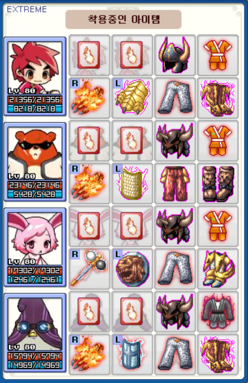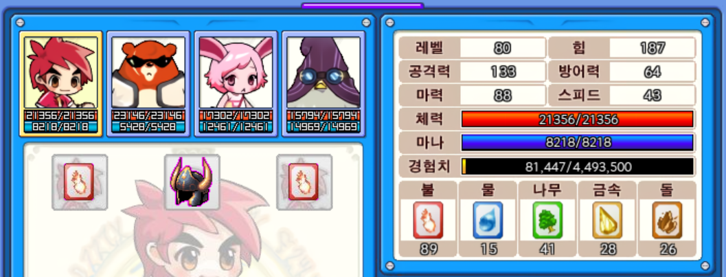 일단 80레벨을 찍어주었습니다. 레벨이 오르면 체력/마나가 오르고 캐릭터마다 각각 힘/마력이 오르게 되는데요.