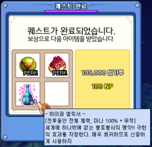 그리고 '하이퍼 엘릭서'를 얻었는데요. 이것도 사기적인 성능을 가지고 있지만 딱히 사용할 일은 없을 것 같습니다.