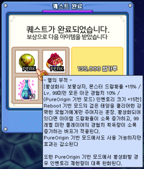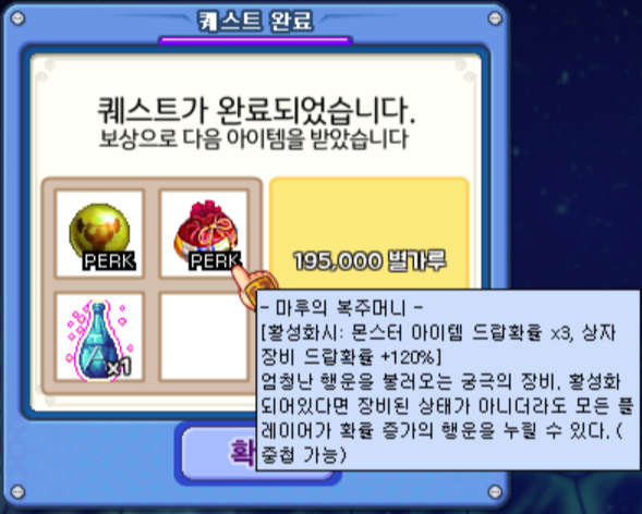 '별의 부적'은 보물상자, 몬스터 드랍확률 +15% 증가에, 레벨 99미만 경험치 +10%. '마루의 복주머니'는 몬스터 아이템 드랍확률 x3, 보물상자 장비 드랍확률 +120%로 상당히 사기적인 성능을 가진 패시브를 얻었습니다.