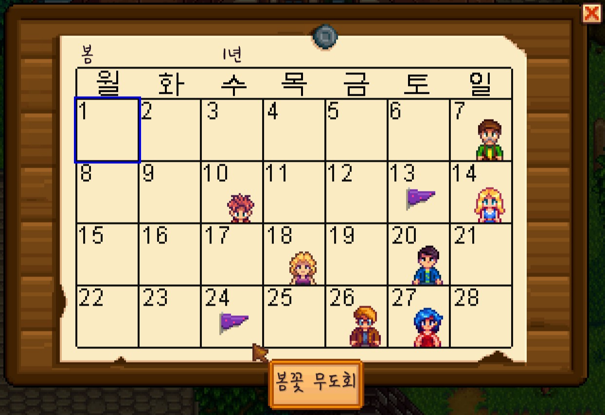 일단 봄 달력을 봤습니다. 봄 막바지에 '봄꽃 무도회'가 있는데, 처음부터 막 호감도 관리를 빡세게 하는게 아닌 이상 NPC와 춤추는 게 쉽지 않습니다.