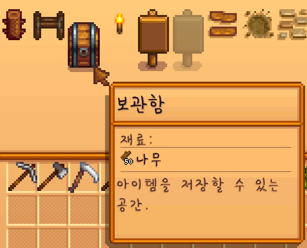 일단 나무를 베고 얻은 목재로 '보관함'을 만들어줬습니다. 이렇게 설치해서 창고로 쓸 수 있는데, 지금은 가방 칸이 작기 때문에 여분 가방 느낌으로 사용할 생각입니다.