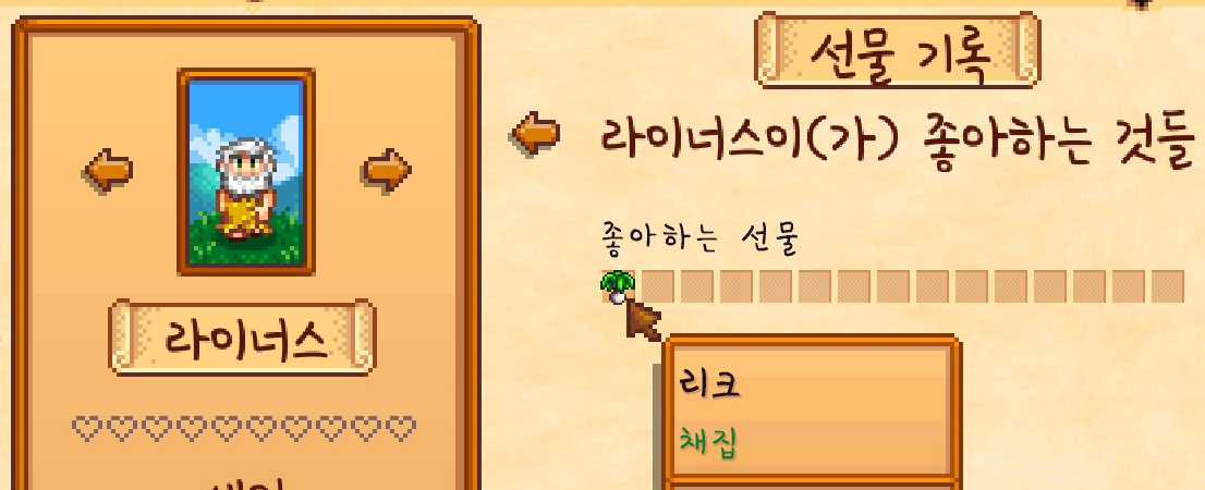라이너스는 보통 채집물들이면 다 좋아하는 편이기 때문에 호감도 관리도 쉬운 편입니다.