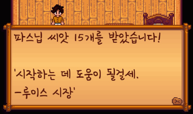 일단 집안 상자를 뜯으면 파스닙 씨앗 15개를 얻을 수 있습니다. 루이스 시장님이 주신 시작 아이템이라고 할 수 있죠.