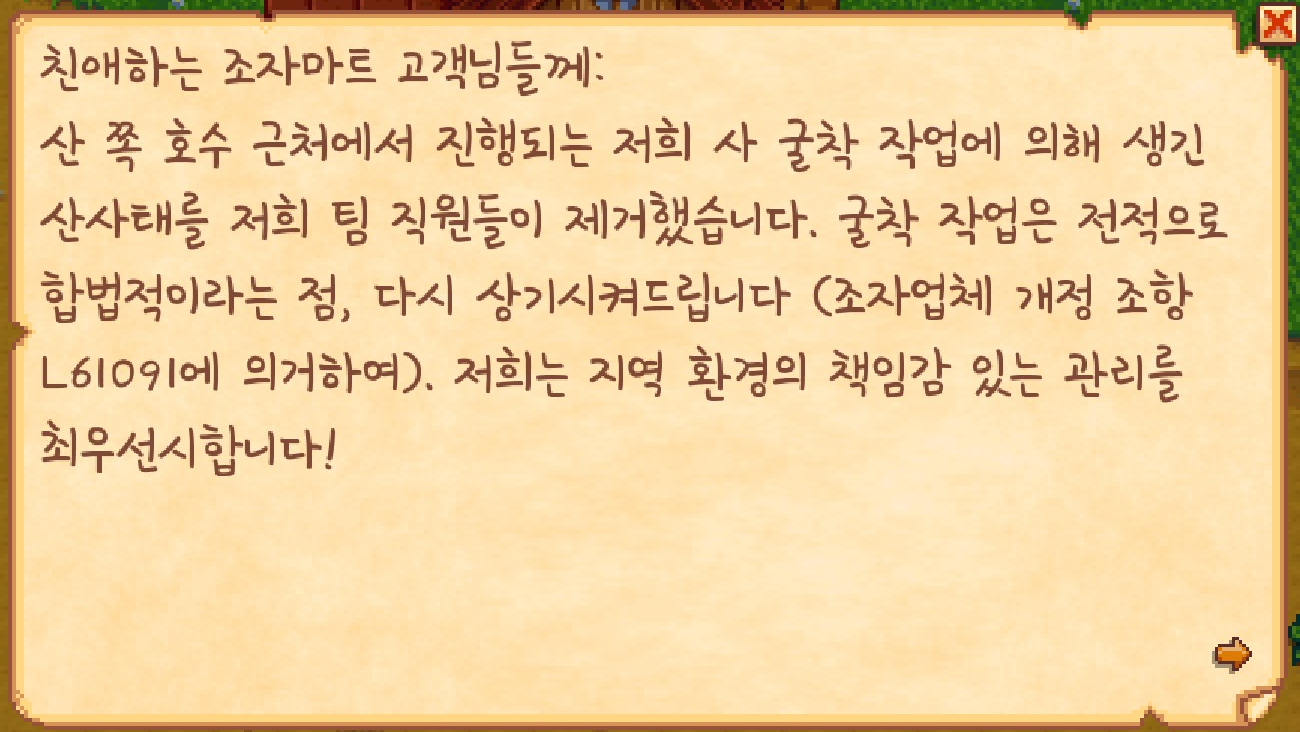 온 편지를 확인해보니 조자마트의 편지였는데요. 산 쪽 호수에 있었던 바위를 제거했다는 편지였습니다. 이제 광산을 갈 수 있게 되었네요.