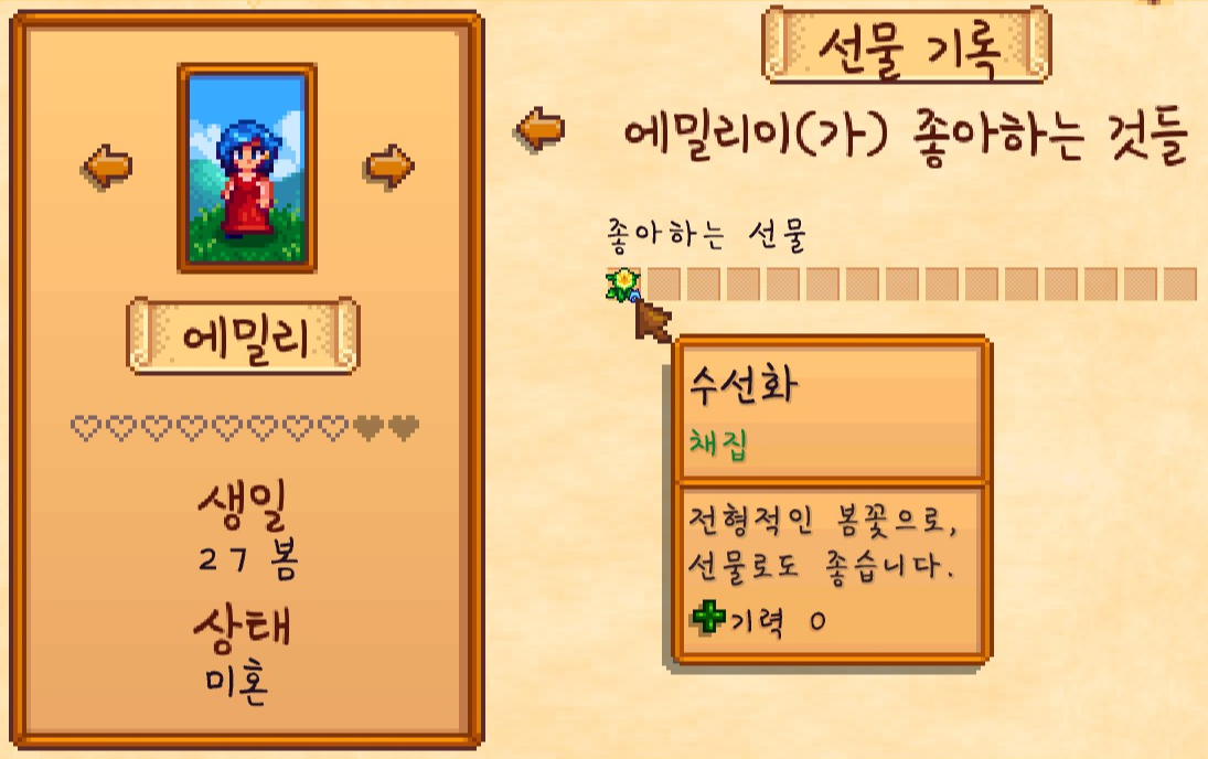 저는 보통 스타듀 밸리를 하면 결혼 상대 '에밀리' 고정으로 플레이 하기 때문에 이번에도 똑같이 할 생각입니다.