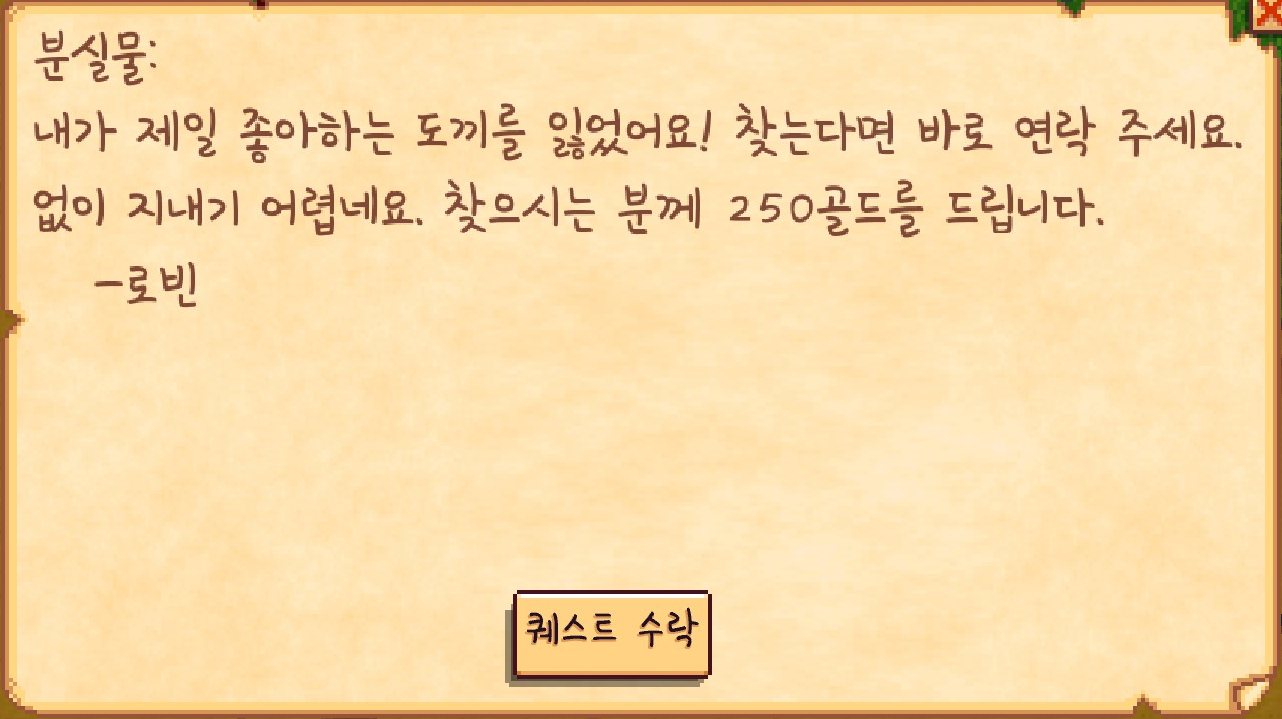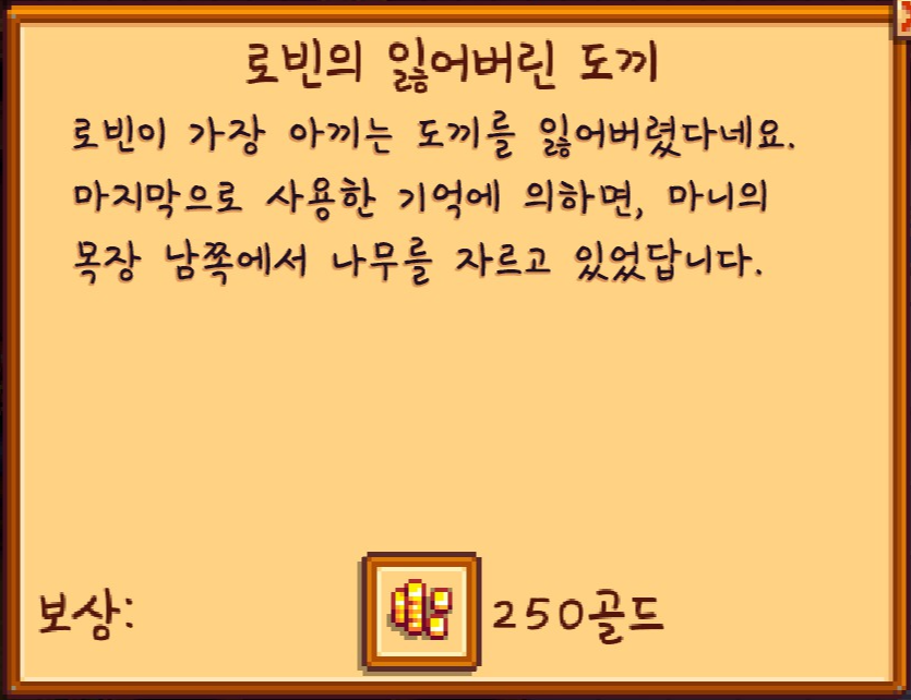 자고 일어나니 편지가 와 있었는데, 로빈의 잃어버린 도끼를 찾아주며 되는 퀘스트였습니다.