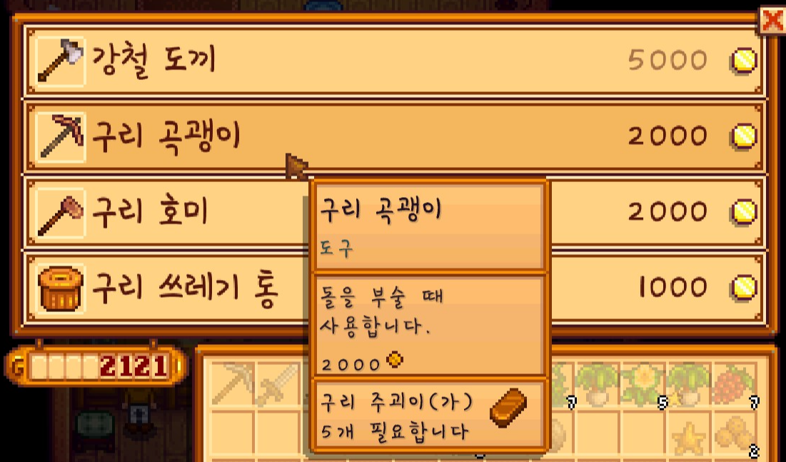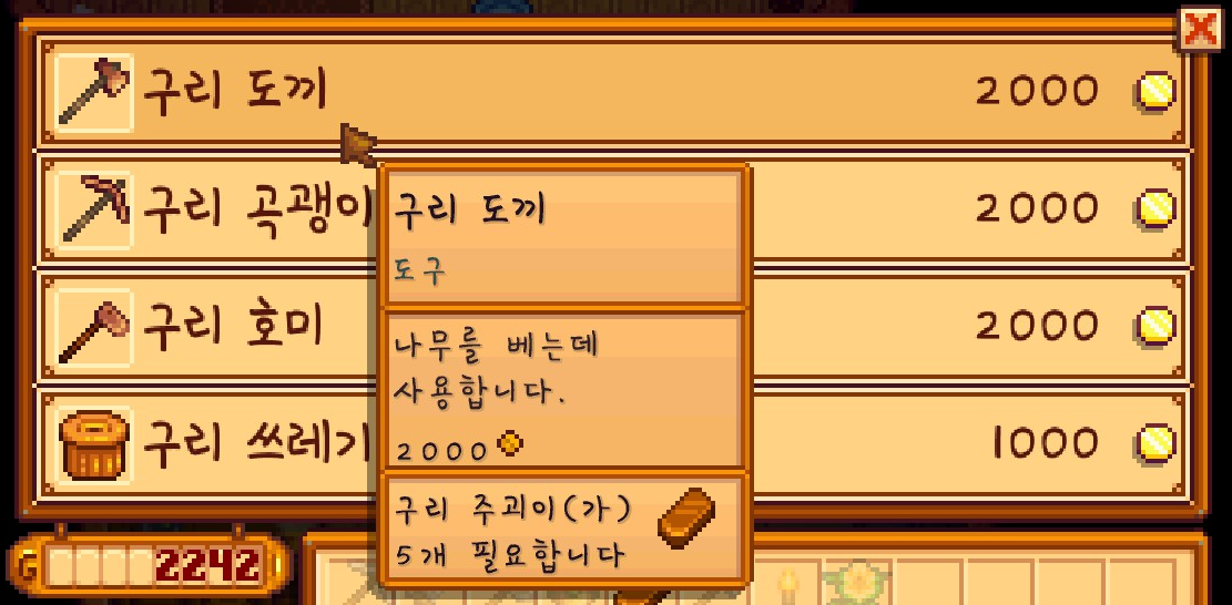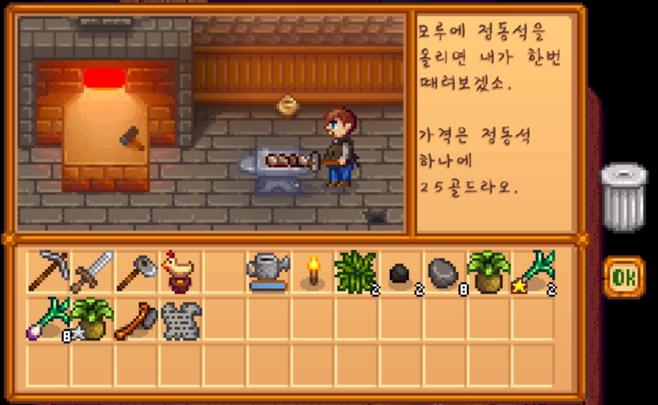 오늘은 돈과 구리 주괴 5개를 챙겨서 도끼를 업그레이드 의뢰를 맡겼습니다.
