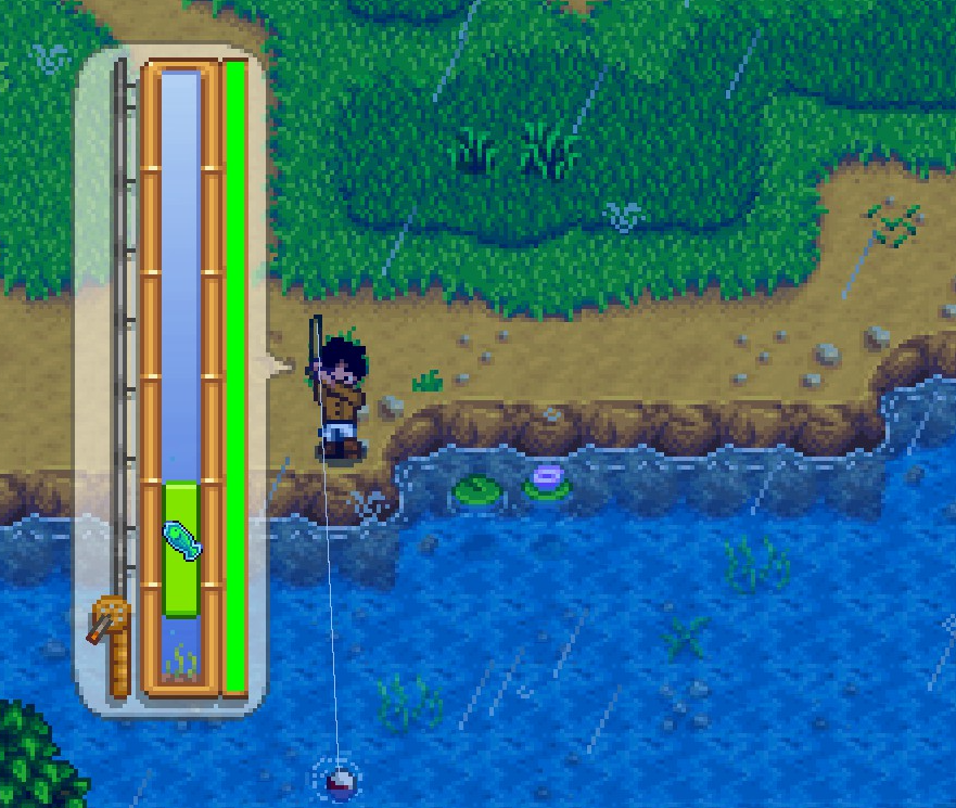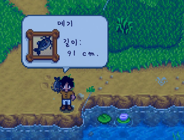 비가 오는 봄에는 메기를 낚을 수 있습니다. 미니게임 난이도가 좀 어렵기는 하지만 낚기만 하면 마리 당 가격이 꽤 나가기 때문에 계속 낚시만 했습니다.