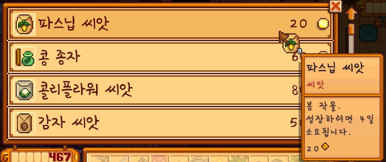 그리고 남은 돈으로 파스닙을 구매했는데요.