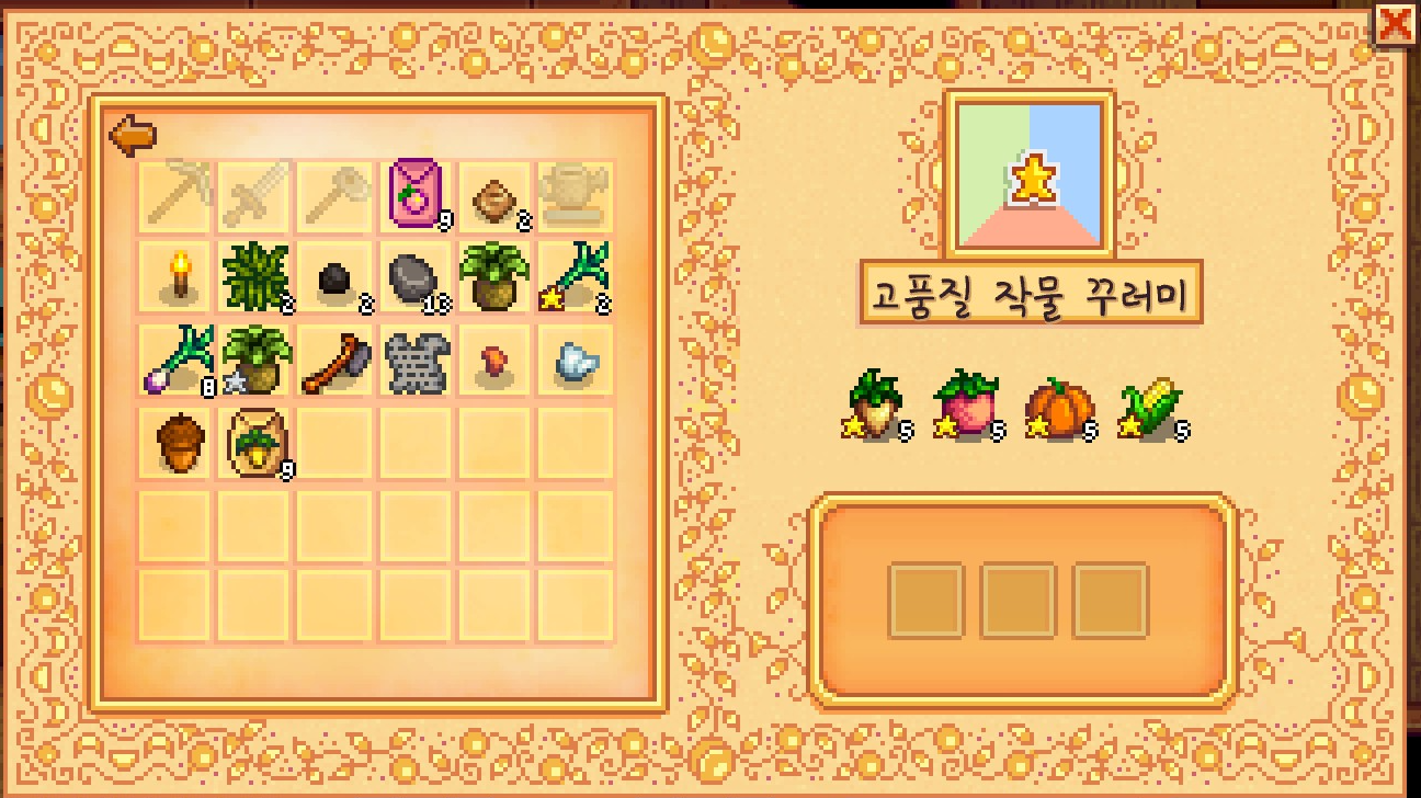 일단 수확한 작물들을 가져와서 번들을 채워 넣었습니다.