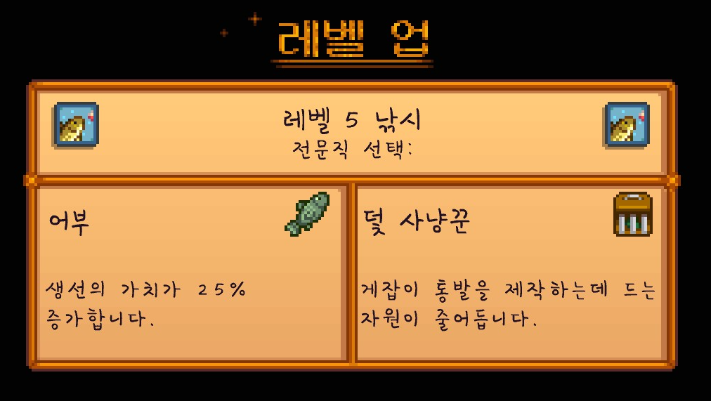 레벨 5를 찍어서 전문직을 선택할 수 있게 되었는데요. 물고기 가격을 올려주는 '어부'를 선택했습니다.
