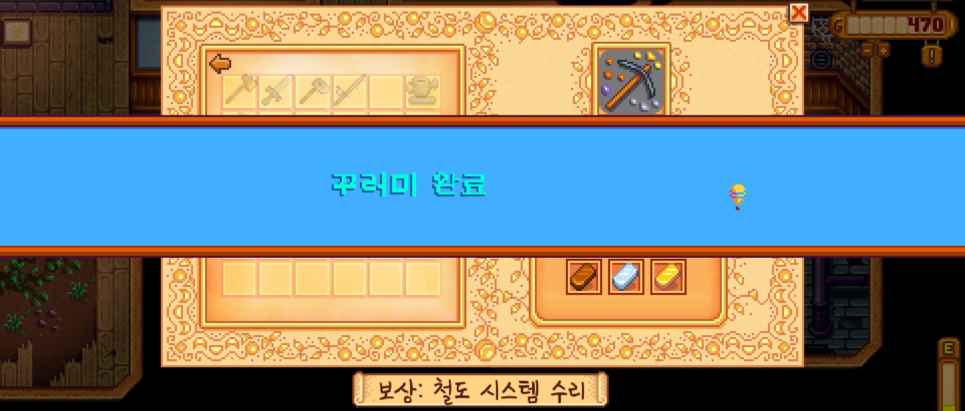 일어나서 바로 구리 곡괭이 업그레이드 의뢰를 맡겼습니다.