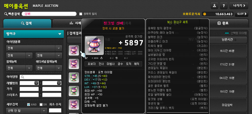 그래도 여기는 리부트는 아니기 때문에 경매장을 이용할 수 있는데요. 아무리 시골섭이라도 추옵 제대로 안 된 매물은 좀 있기 때문에 그냥 구매했습니다. 일단은 '보스 장신구 세트'를 맞추는데에 집중했습니다.