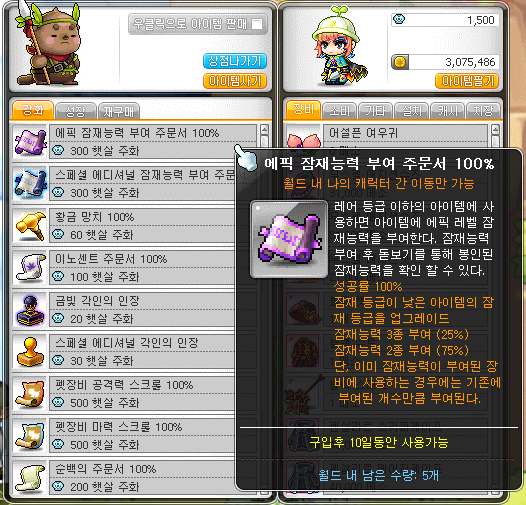 그리고 지금 코인샵이 있어서 에픽 잠재 주문서를 구매를 해서 엠블렘에 사용을 했습니다. 무조건 세팅은 무기, 보조무기, 엠블렘이 먼저라고 들어서 바로 사용을 해줬습니다.