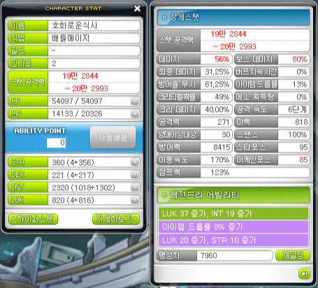 보스 장신구 7세트 효과를 받으니 주스탯 2300, 스공 20만 정도 올랐습니다. 그리고 방무도 조금 올랐네요.