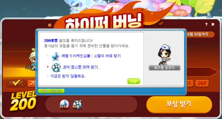 하이퍼 버닝 200레벨 보상은 여로 심볼 5레벨과 젬스톤 50개를 주네요. 막 엄청나게 많다 이런건 아닌데 이정도면 기본 스킬 세팅 정도는 될 것 같네요.