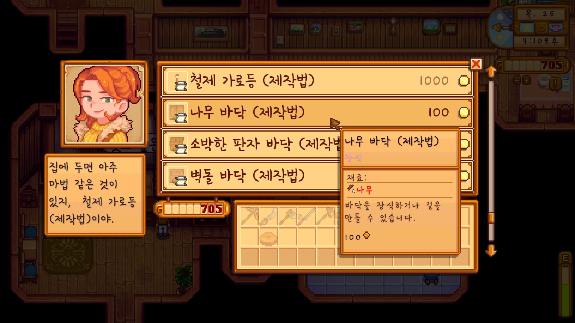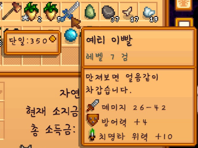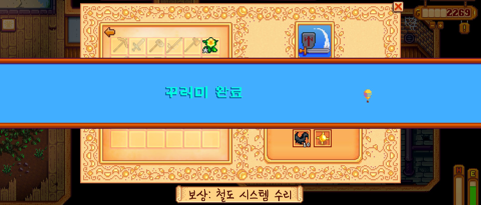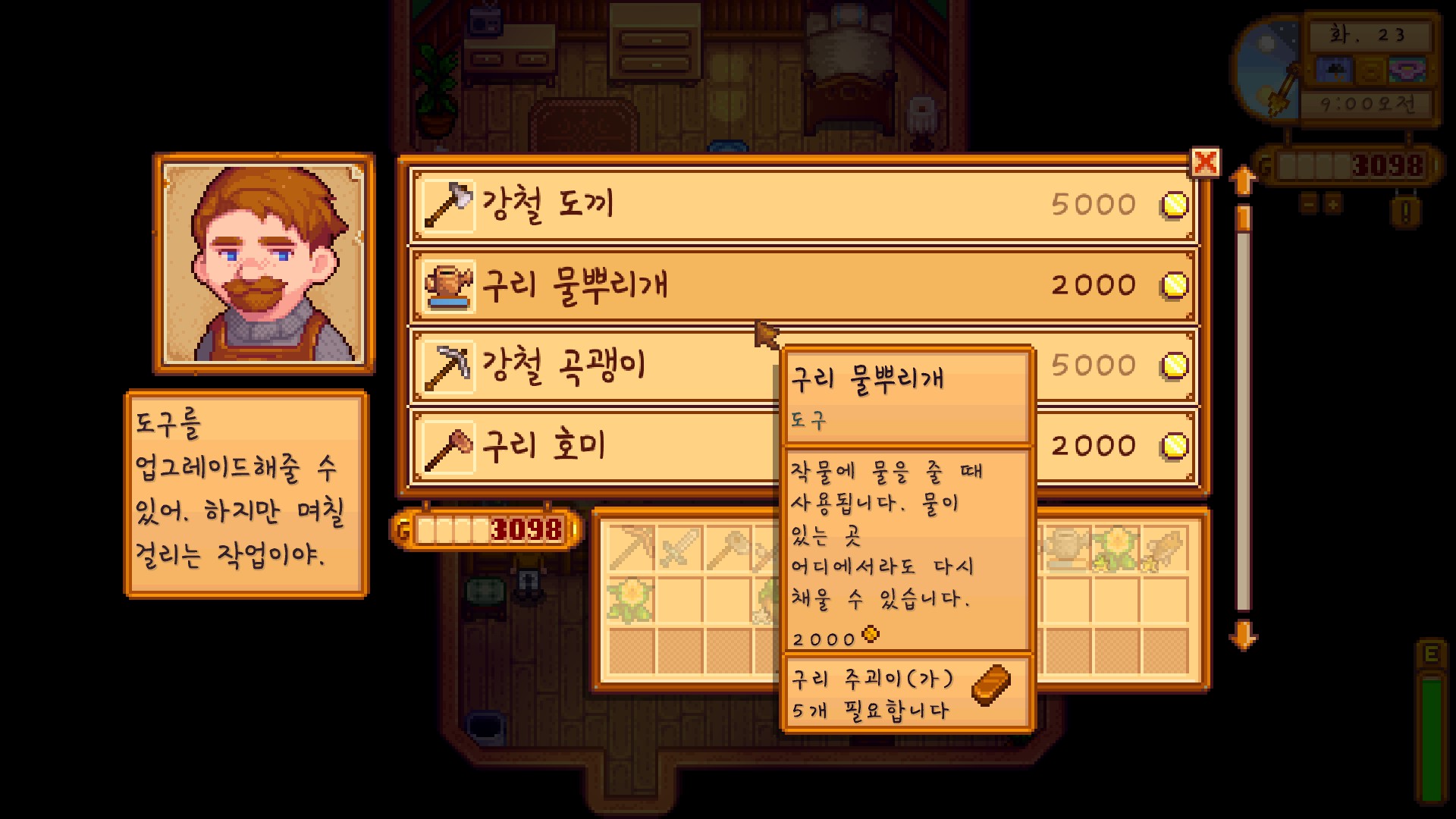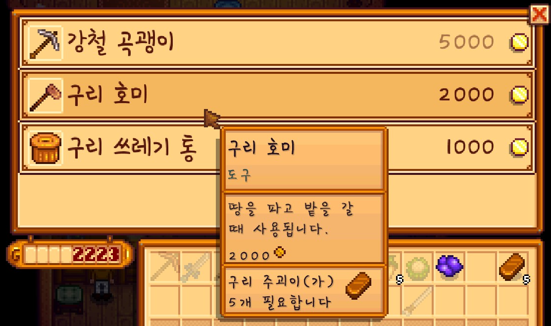 일단은 돈을 모아서 바로 구리 호미 업그레이드 의뢰를 맡겼습니다. 이러면 여름이 오기 전에 구리 세트로 맞출 수 있겠네요.