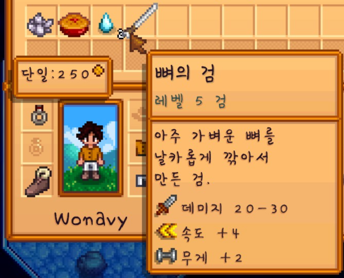 광부질을 하고 있었는데, 뼈의 검을 얻었습니다. 생각보다 능력치가 좋아서 이거를 장착해주도록 하겠습니다.