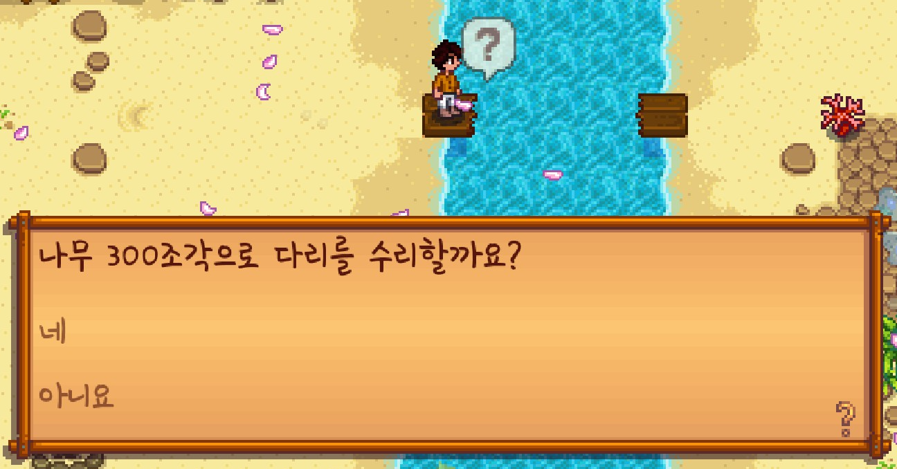 일단 나무 300개를 모아서 해변가 옆에 있는 다리를 수리를 했습니다. 옆 해변에 떨어진 산호초 가격이 꽤나 쏠쏠해서 시간날 때 주워서 팔면 되겠네요.