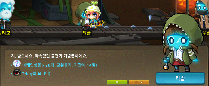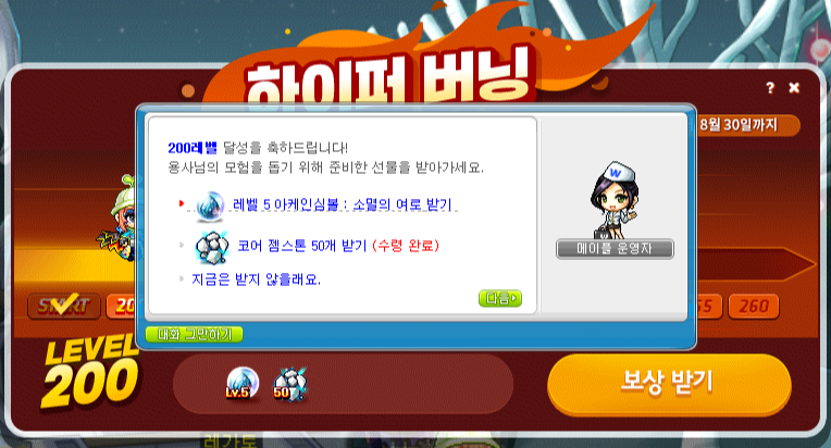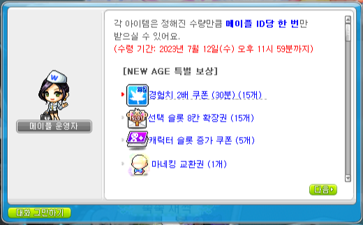 그리고 메이플 운영자에게 말을 걸어서 다양한 보상들을 수령했습니다. 특히 선택 슬롯 확장권이 필요했었는데 잘 됐네요.