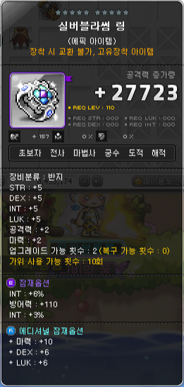 실버블라썸 링 인트 9퍼가 경매장에서 2000만 메소에 구매했습니다. 다소 비싸기는 하나 매물이 이거밖에 없어서 어쩔 수 없었습니다.