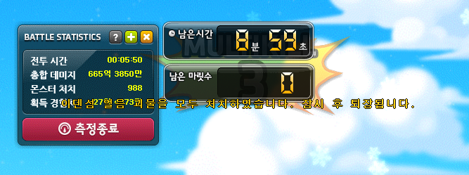 전투 분석으로 경험치를 측정해 보니 27억 정도 먹었습니다. 그냥 경험치 2배 쿠폰만 쓰고 들어갔는데 이 정도로 많이 주면 나중에는 룬 버프, 경뿌, 익스트림 골드 이런 거 다 받고 들어가는 게 가장 효율이 좋을 것 같네요.