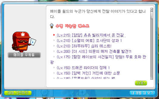 그리고 215 레벨에 달성해서 바로 얌얌 아일랜드도 가서 길뚫 퀘스트를 했습니다.