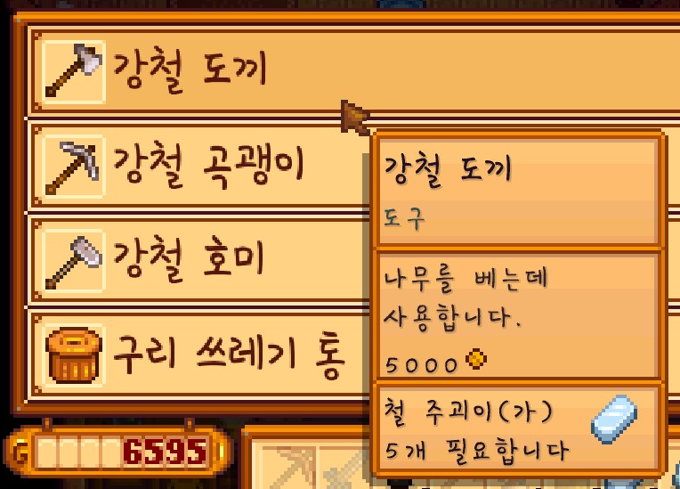 의뢰를 맡겼던 강철 도끼를 다시 얻을 수 있었습니다. 그런 다음 바로 강철 곡괭이 의뢰를 맡겼습니다. 뭔가 클린트를 쉬게 놔두면 손해인 것 같다는 느낌이 들더라고요.