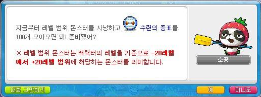 레벨 범위 몬스터를 사냥해서 '수련의 증표' 100개를 모아야