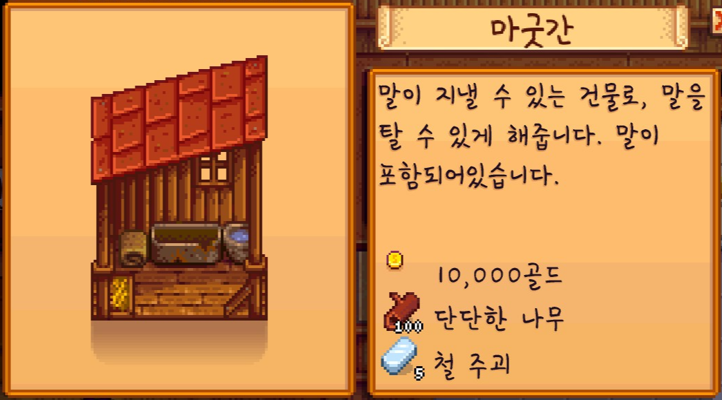 그리고 지금까지 모았던 단단한 나무가 100개를 넘어서 바로 마굿간을 건설했습니다. 말을 타고 다니면 그만큼 이동시간이 단축되기 때문에 필수라고 할 수 있죠.