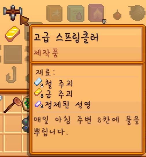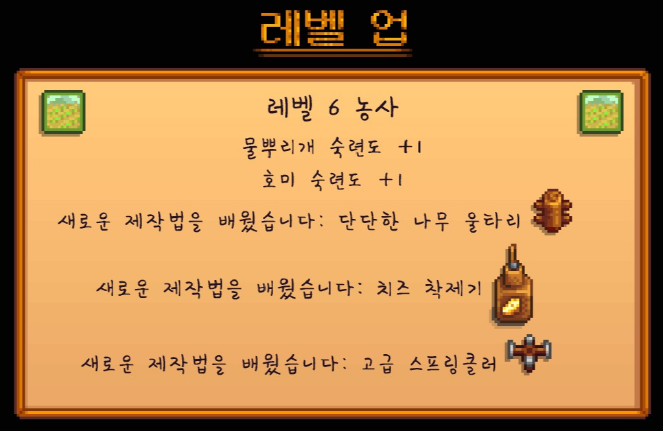 드디어 농사 6레벨을 달성했습니다. 이제 '고급 스프링클러'를 만들 수 있게 됐는데요. 이게 있으면 이제 물 뿌리는 노동은 거의 하지 않아도 되서 이때부터 게임이 편해지죠.