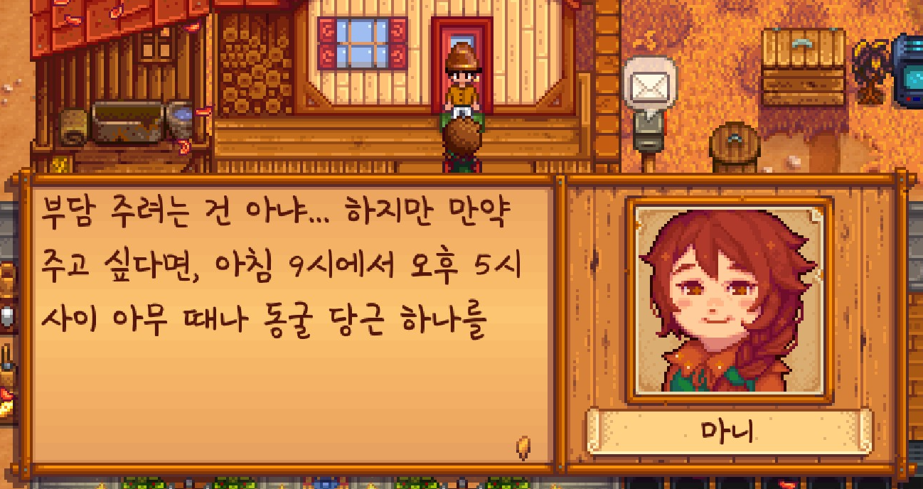 자고 일어나니 마니가 집앞으로 찾아왔습니다. 동굴 당근을 하나 가지고 와 달라는 그런 부탁이었는데요.