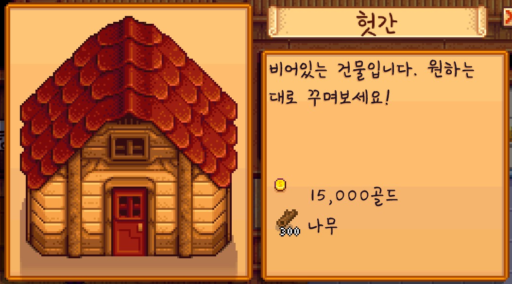 돈과 재료를 모아서 헛간 건설 의뢰를 맡겼습니다. 이 헛간에는 나중에 작물들을 와인으로 만드는 공장이 될 예정입니다.