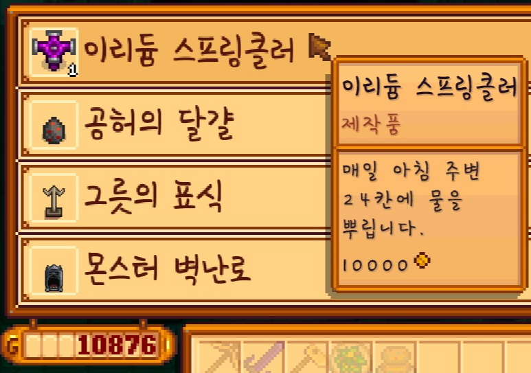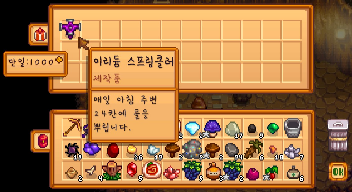 남은 시간에는 해골 동굴로 향했는데 정말 운 좋게 이리듐 스프링클러를 얻었습니다. 지금은 가을 막바지라 활용이 어렵고, 내년 봄쯤에 잘 써먹어 봐야겠네요.