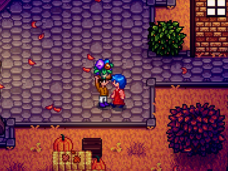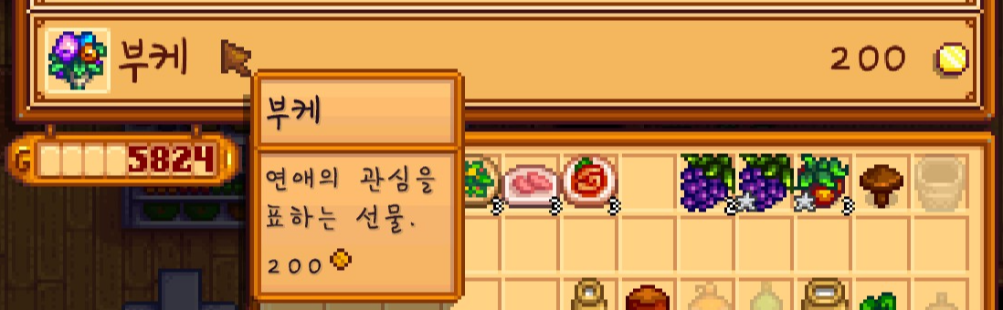바로 피에르의 잡화점으로 찾아가 부케를 구입했습니다. 호감도를 채우고 부케를 선물하면 연인이 될 수 있죠.