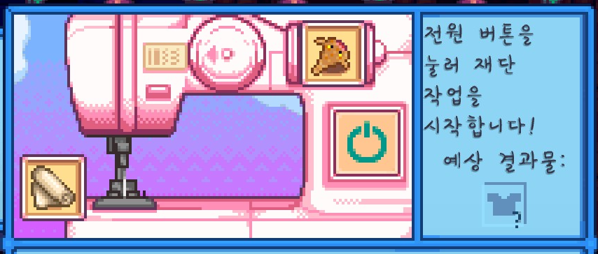 그리고 심심해서 상자에 있었던 옷감을 꺼내서 재봉틀로 의류를 만들어보기로 했는데요. 딱히 넣을 게 없어서 인벤토리에 있던 물고기를 넣어봤는데요.
