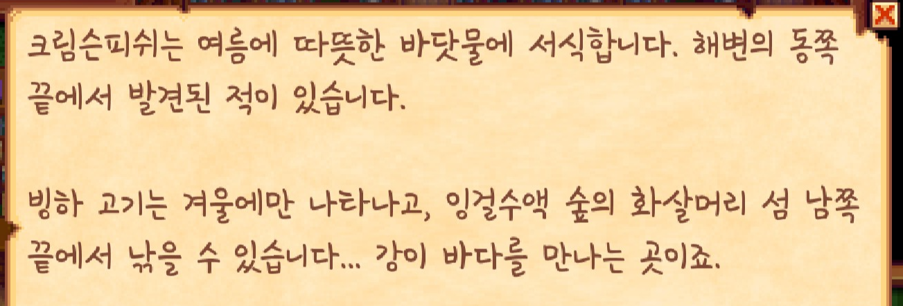 그리고 전설 물고기 위치도 알 수 있는 책도 있었는데요. 크림슨피쉬는 위치를 우연히 맞아떨어져서 알게 돼서 낚을 수 있었고요.