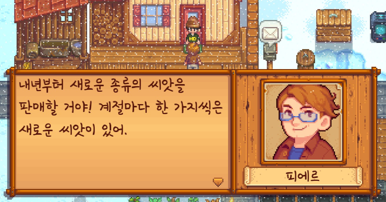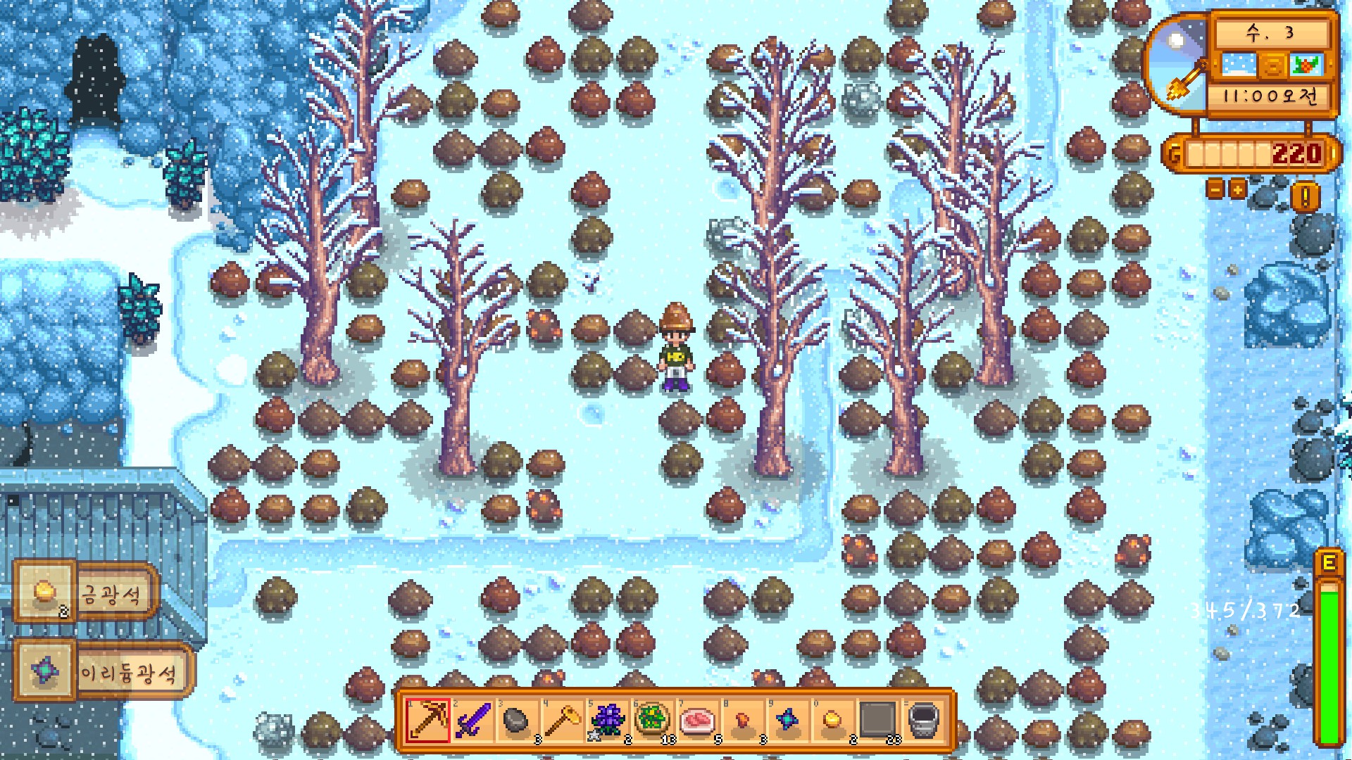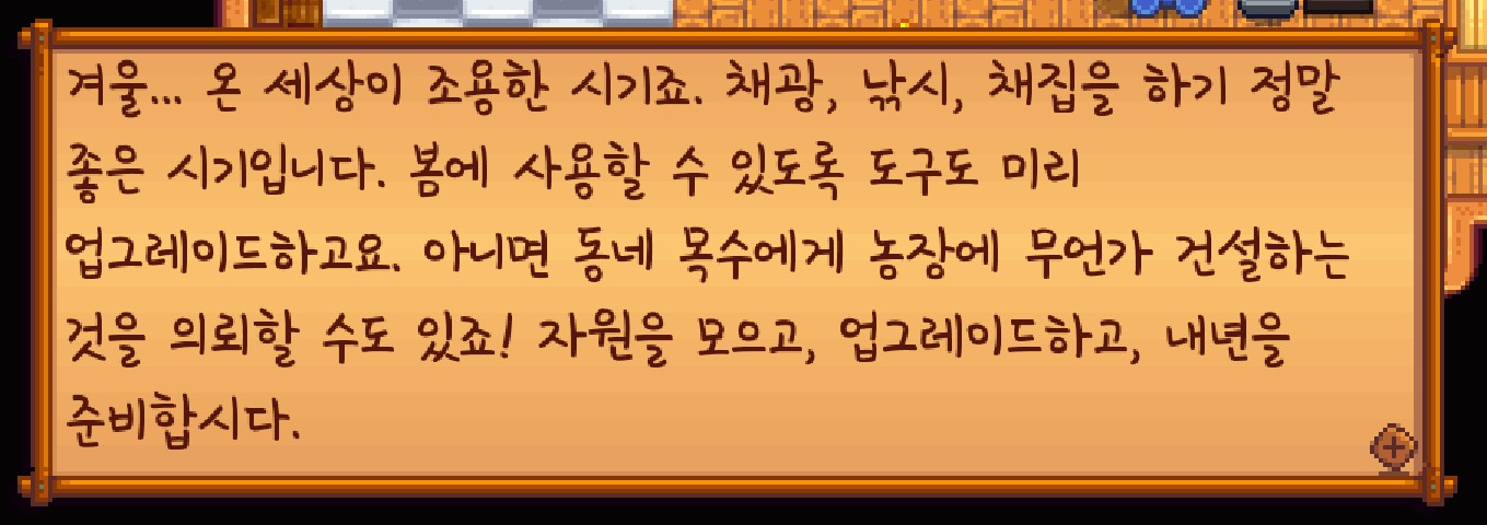 드디어 겨울이 왔습니다. 겨울에는 온실이 아닌 이상 농사를 지을 수가 없는데요. 그동안 채광이나 농장을 꾸미면서 시간을 보내려고 합니다.