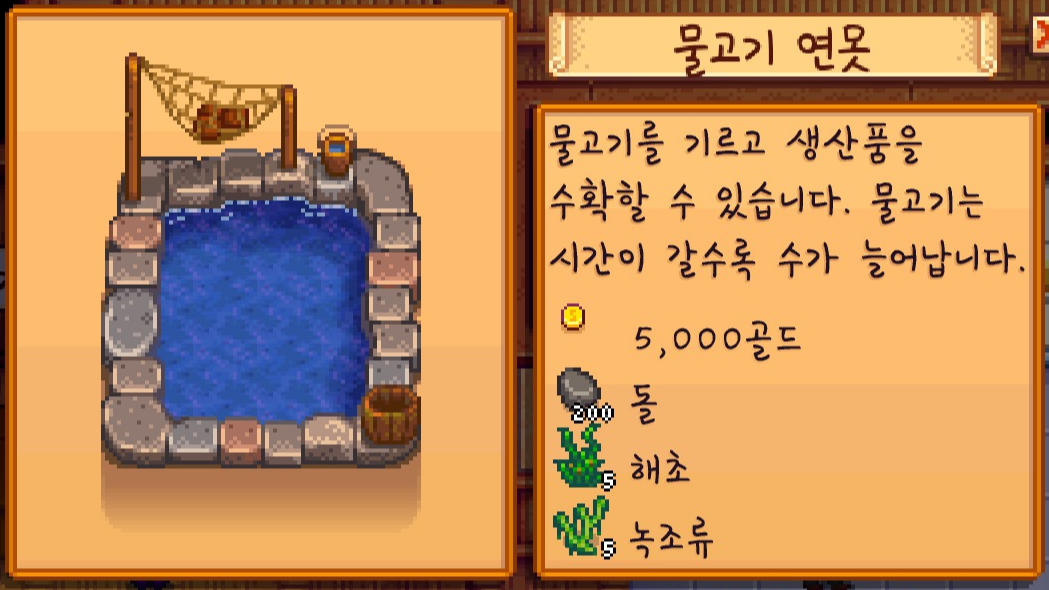 그리고 겸사겸사 연못 건설 의뢰를 맡겼습니다. 여기에 물고기를 넣으면 물고기 특성에 맞는 아이템을 얻을 수 있습니다.