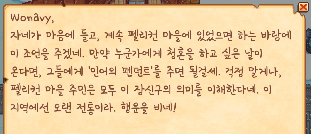 루이스 시장님이 결혼을 하기 위해서는 인어의 펜던트를 주면 된다고 하는 내용입니다. 마음 같아서는 바로 결혼을 하고 싶은데 조금만 더 농장을 정리하고 할 생각입니다.
