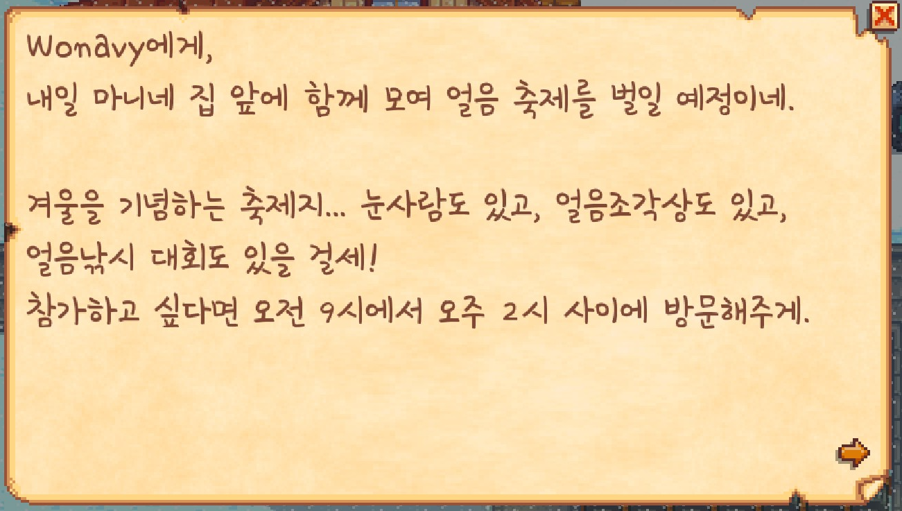 | [스타듀 밸리] #11 - 결혼을 위한 혼수 자금 마련하기 | 1년 차 겨울 2 (0) | 2023.08.15 |