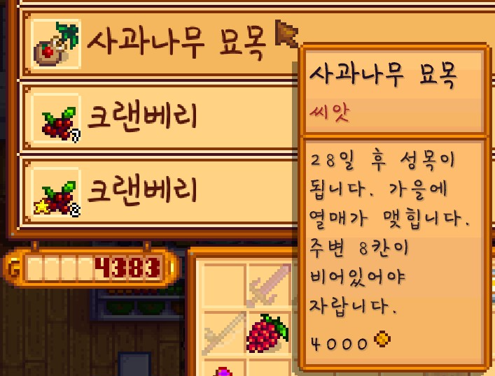 그리고 사과나무 묘목을 구입했습니다. 번들에는 사과 3개가 필요한데요. 과일 박쥐가 사과를 물어오는 것을 기다릴 바에는 그냥 심는 것이 나을 것 같다는 생각을 했습니다.